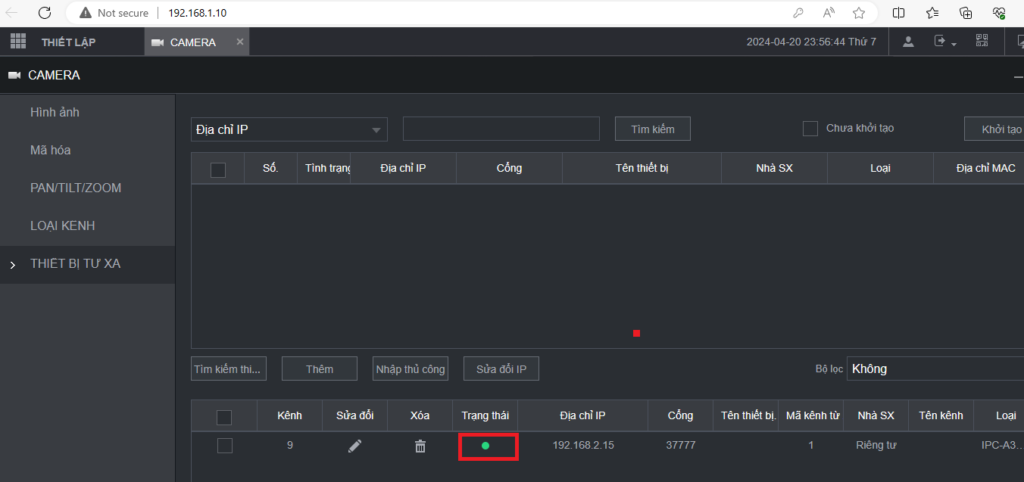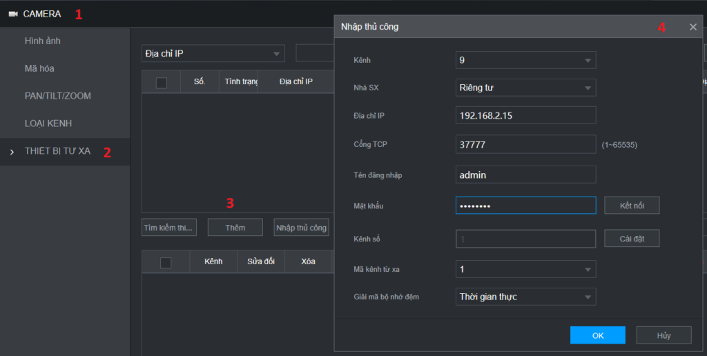 Truy cập vào đầu ghi chọn THIẾT LẬP -> CAMERA -> THIẾT BỊ TỪ XA -> NHẬP THỦ CÔNG.
